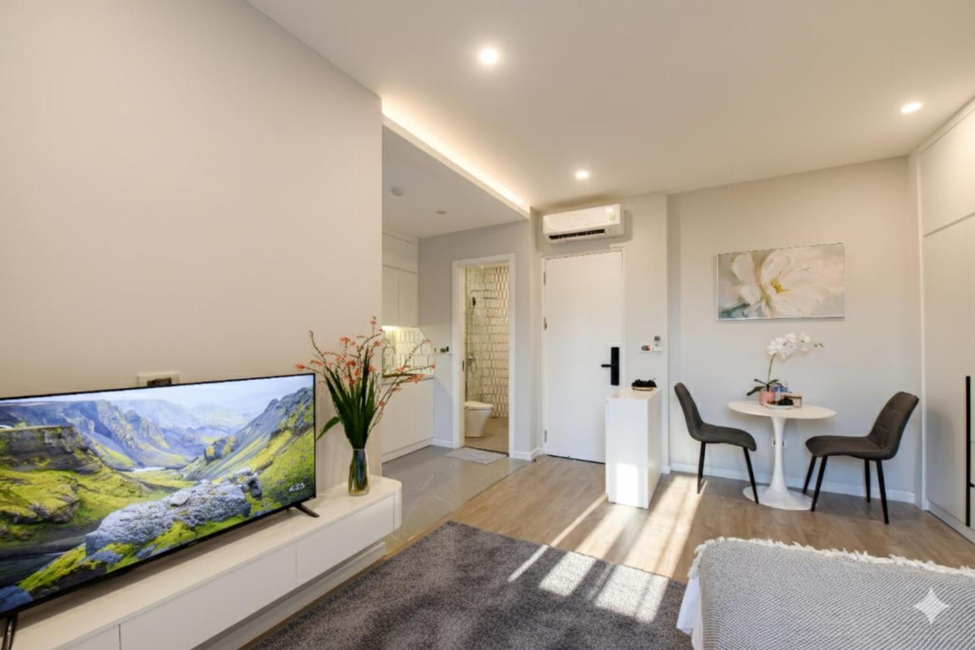 Deluxe Queen Studio. Offering free toiletries, this studio includes a private bathroom with a shower, a hairdryer and slippers. The fully equipped kitchen has a stovetop, a refrigerator, kitchenware and a microwave. This studio is air-conditioned and features a seating area with a flat-screen TV, a washing machine, soundproof walls, a dining area, as well as a wardrobe. The unit offers 1 bed. ;